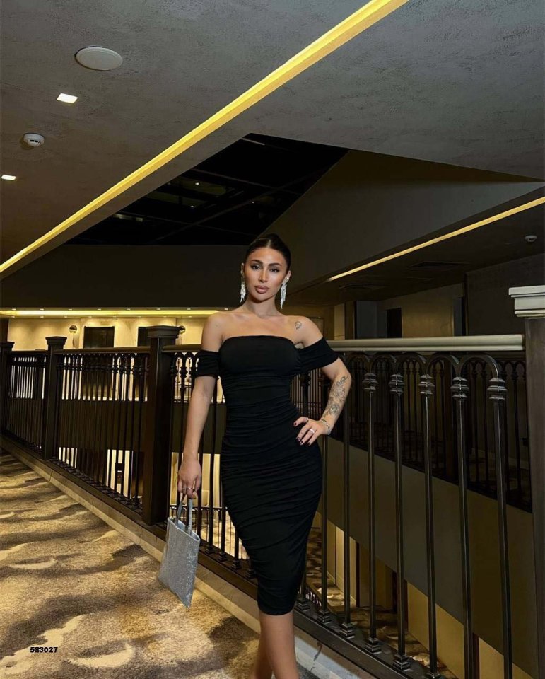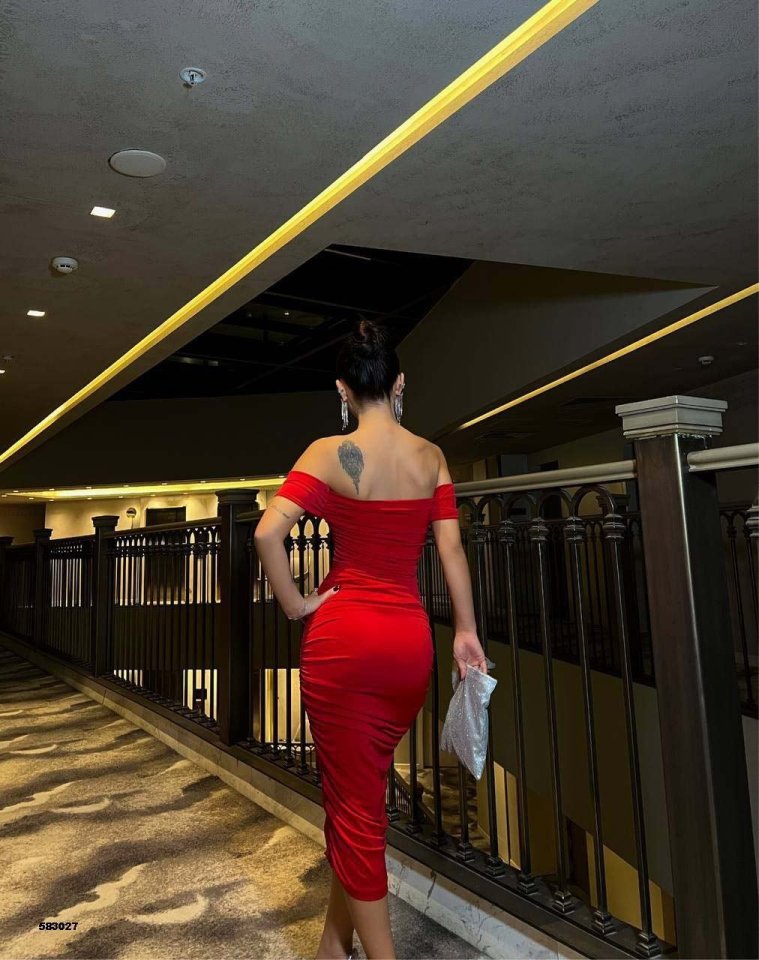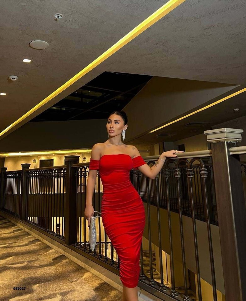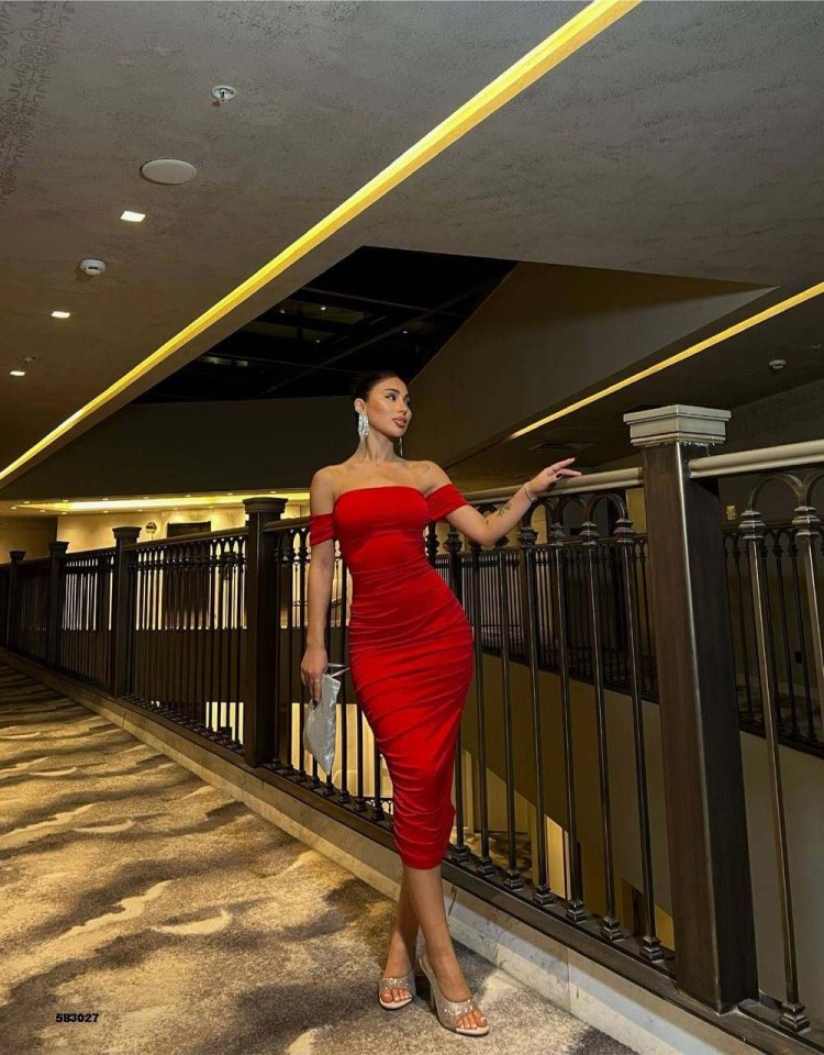 Kadın Madonna Yaka Sandy Kumaş Büzgü Detay Midi Boy Elbise