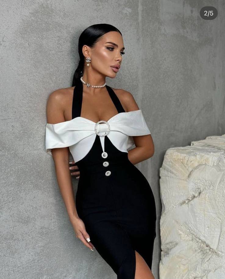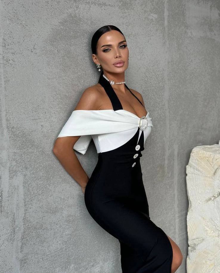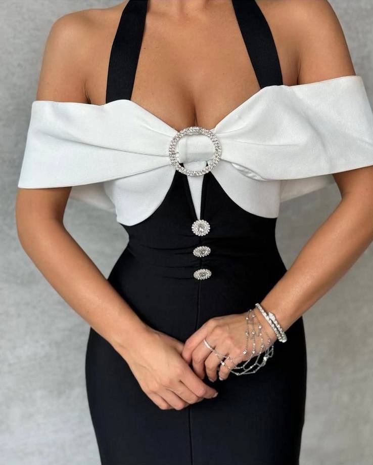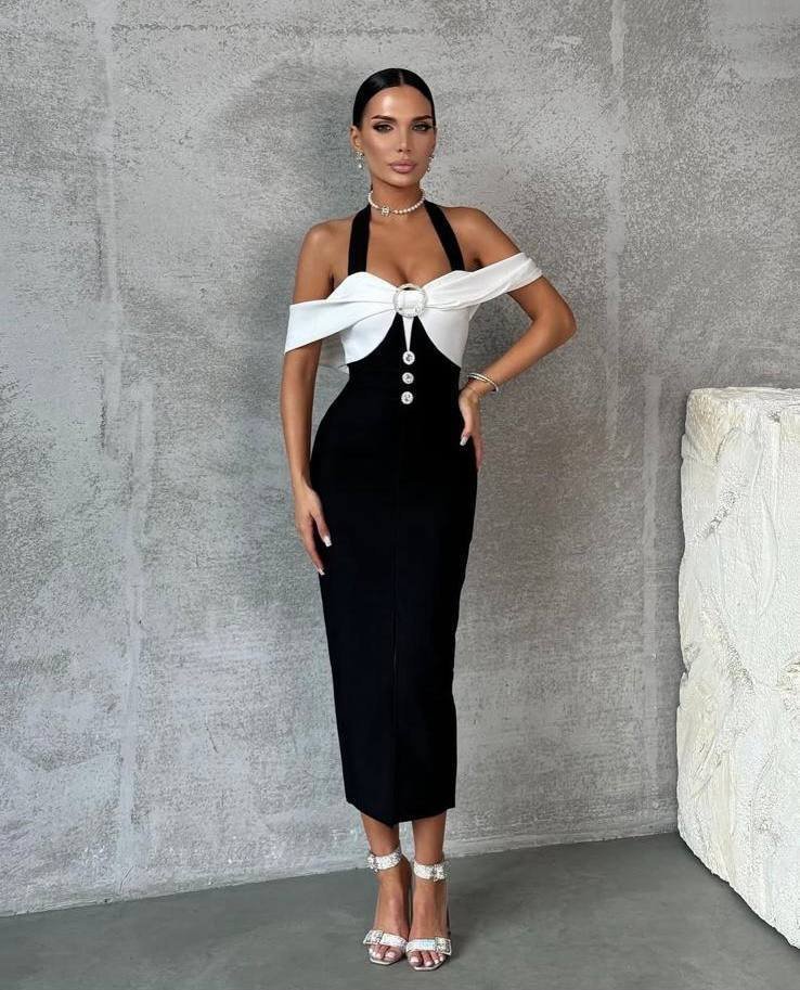 Kadın Madonna Yaka Tasarım Taş Ve Düğme Detay Dalgıç Kumaş Elbise