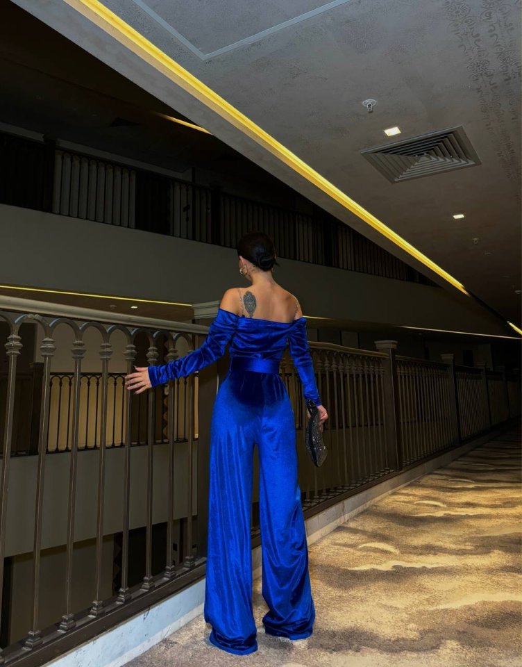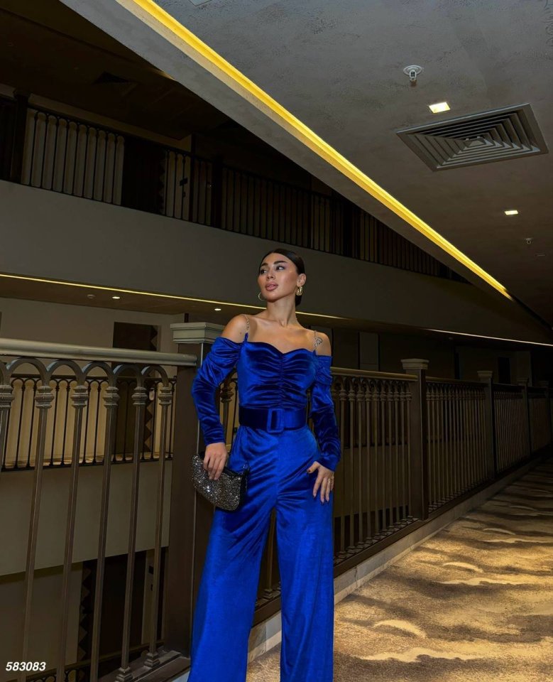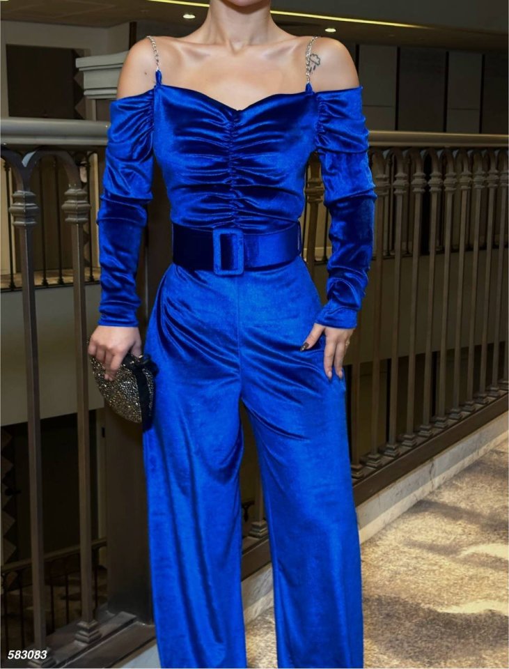 Kadın Modanna Yaka Zincir Askı Detay Kemer Dahil Kadife Kumaş Tulum