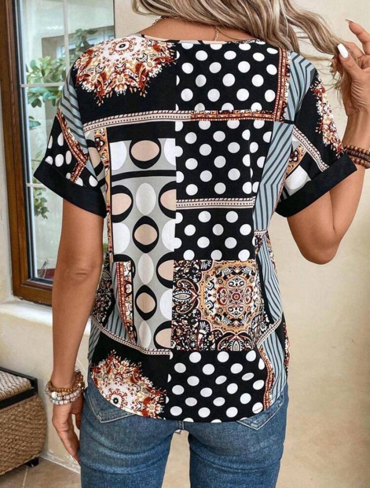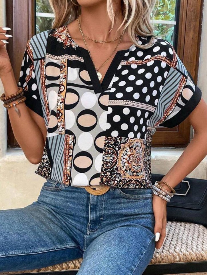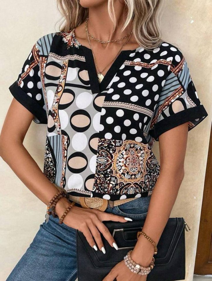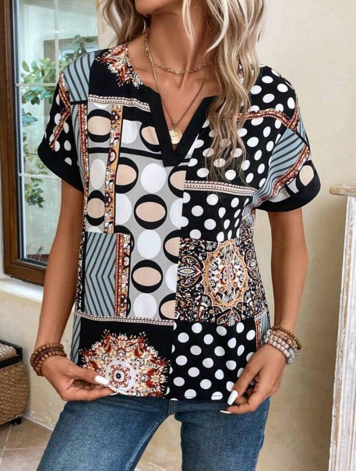 Kadın Moss Krep Kumaş çentik V Yaka Kısa Kollu Desenli Bluz