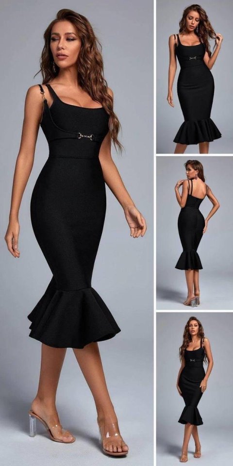 Kadın Omuz Askılı Sırt Dekolteli Interlok Kumaş Midi Kalem Elbise