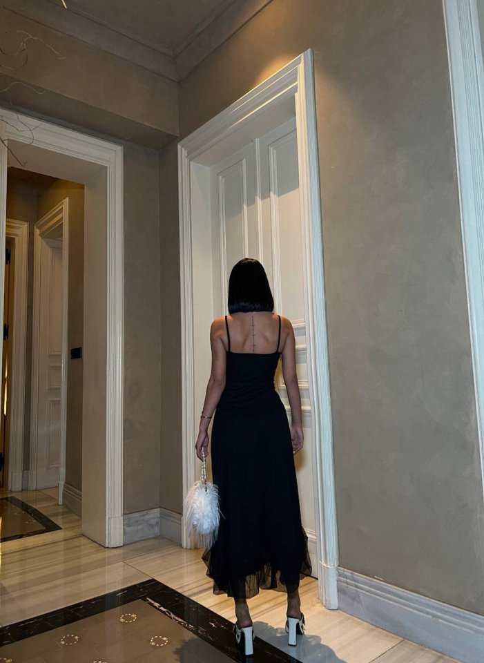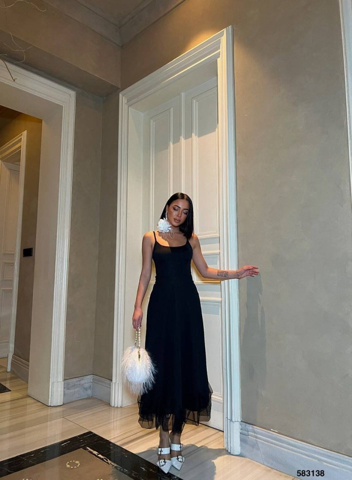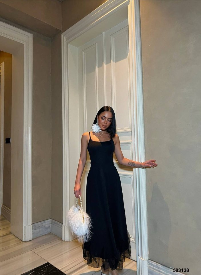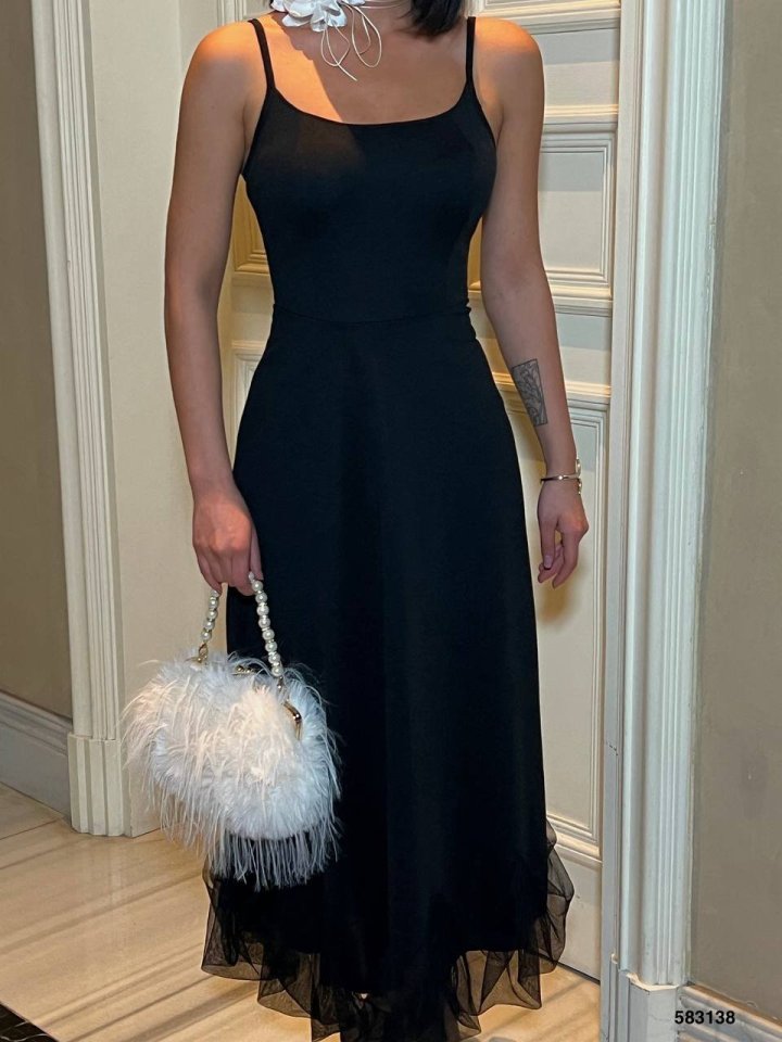 Kadın Omuz Askılıeteği Tül Volan Detay Midi Boy Elbise