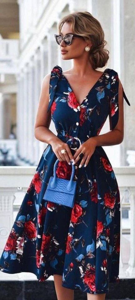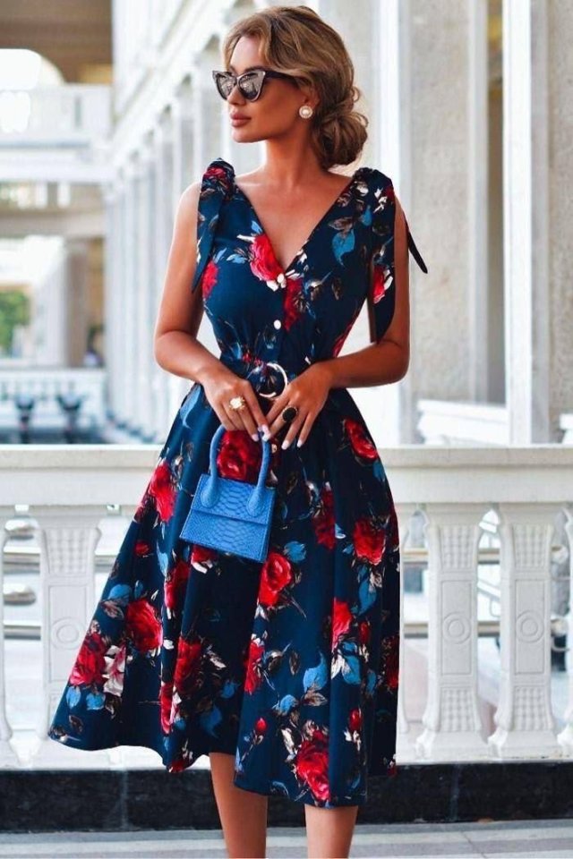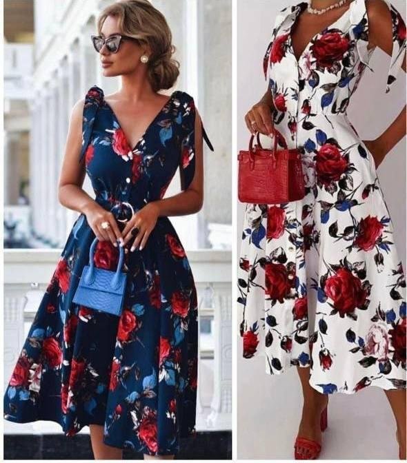 Kadın Omuz Kurdale Detay çiçek Baskılı Midi Elbise