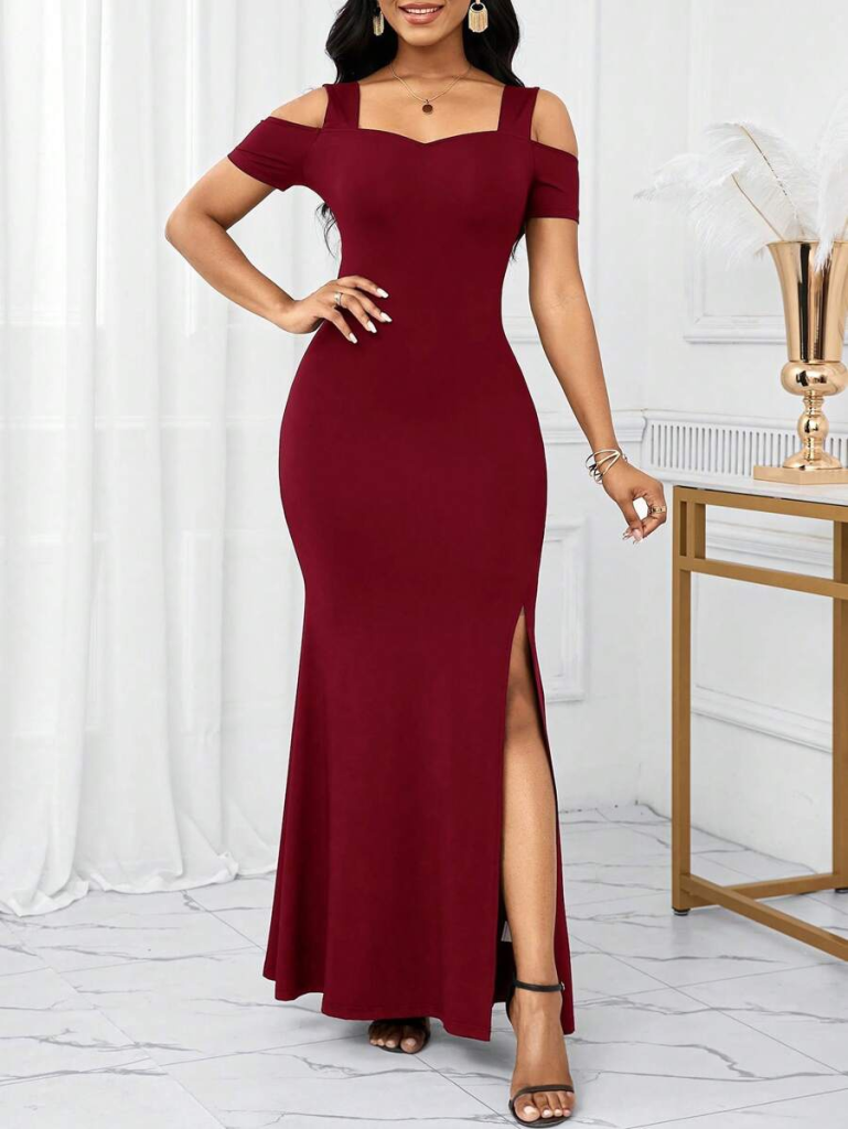Kadın Omuzlardan Açık Askılı Yırtmaç Detaylı Uzun Ithal Krep Elbise