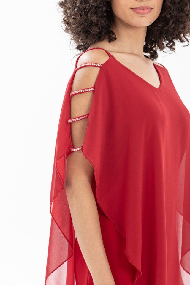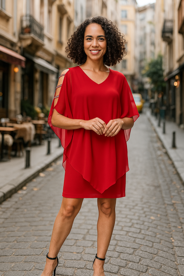 Kadın Omzu Açık V Yaka Şifonlu Sandy Kumaş Fırsat Ürün Diz Üstü Elbise