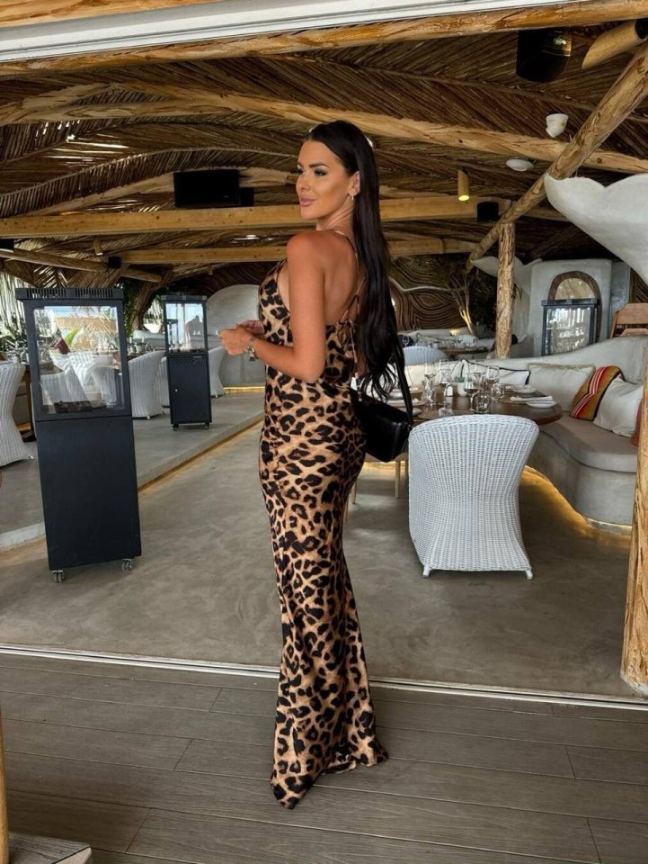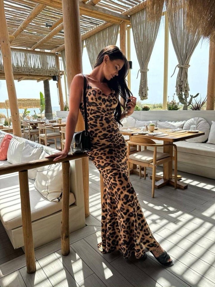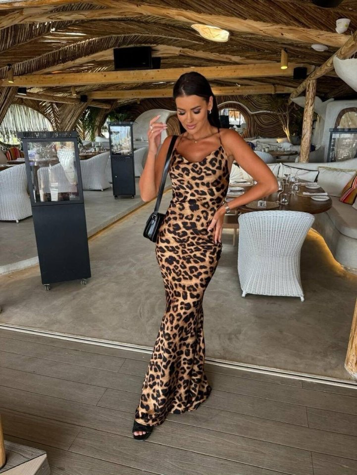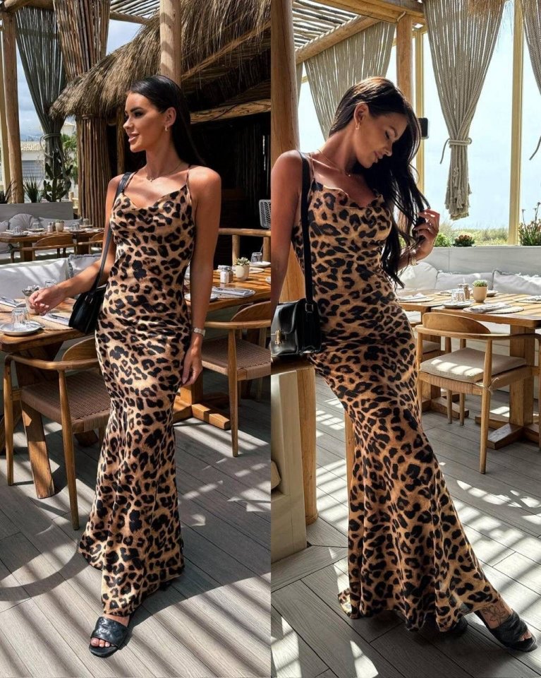 Kadın Saten Kumaş Leopar Desenli Uzun Askılı Elbise