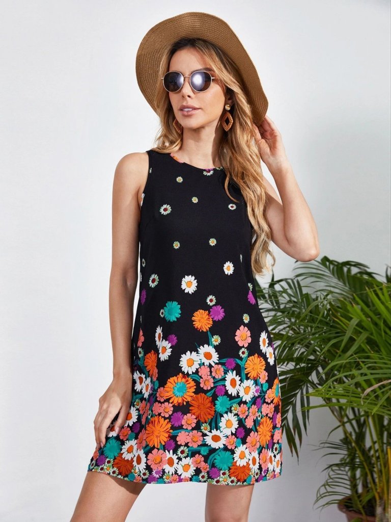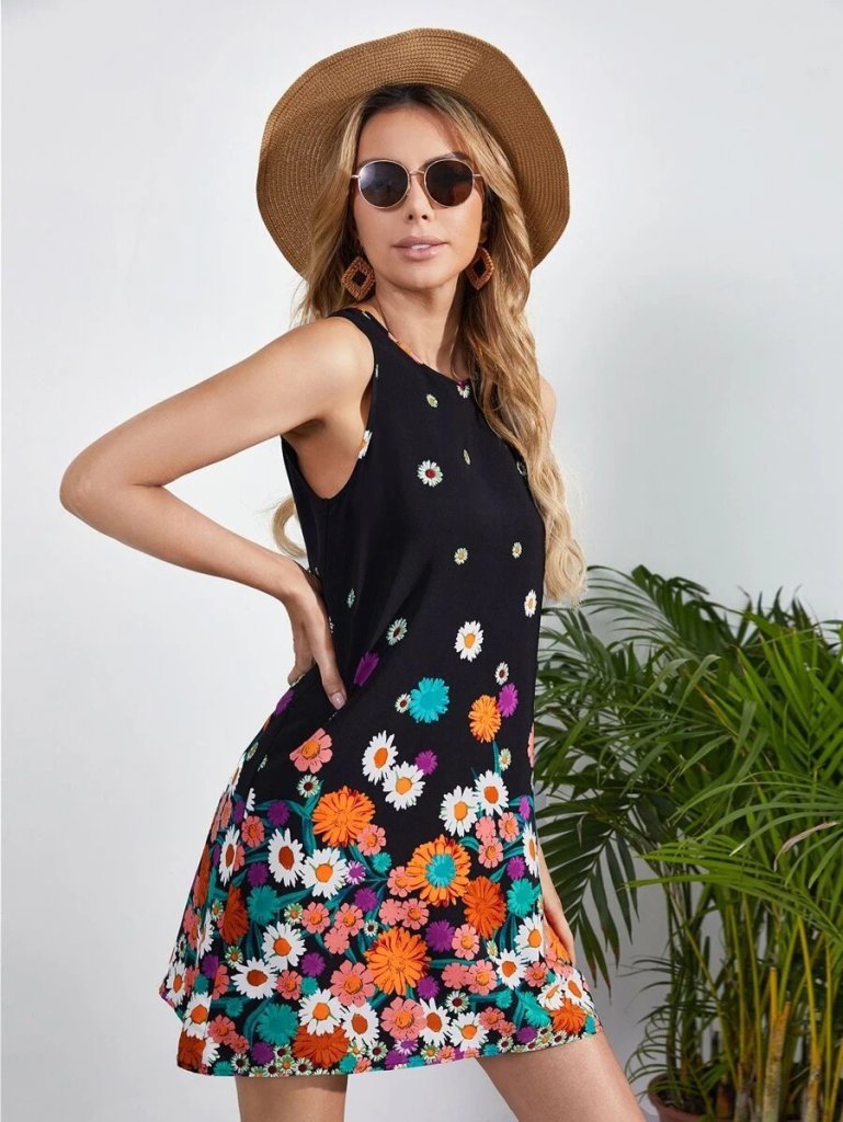 Kadın Sıfır Kollu Bisiklet Yaka çiçek Desenli Süprem Mini Elbise
