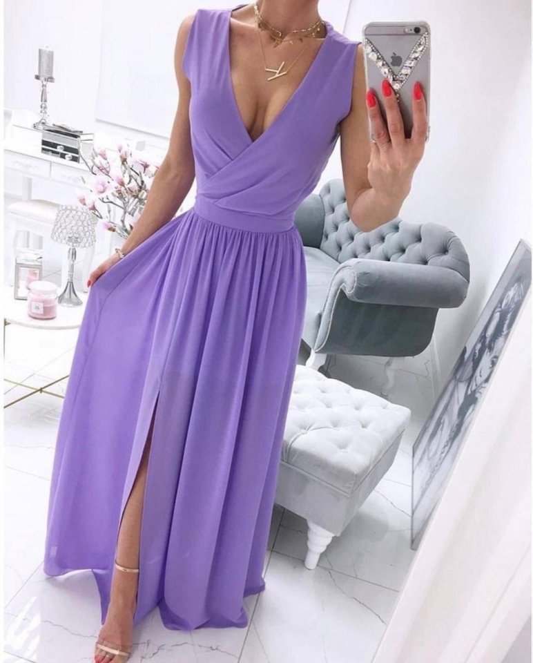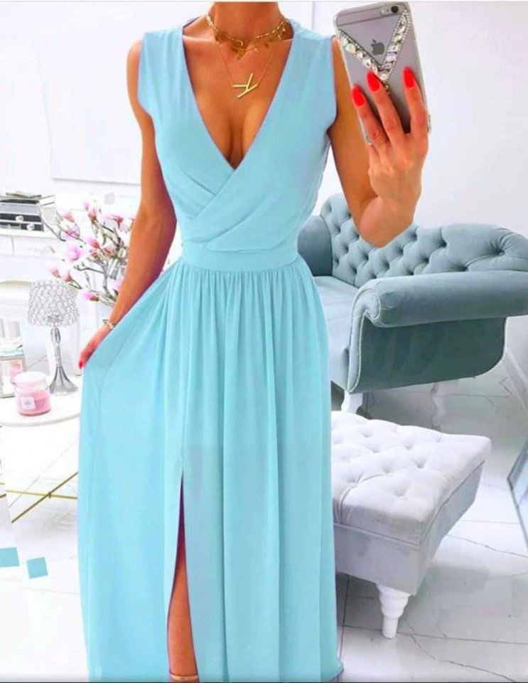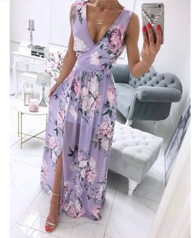 Kadın şifon Kumaş V Yaka Sıfır Kol Maxi Boy Elbise