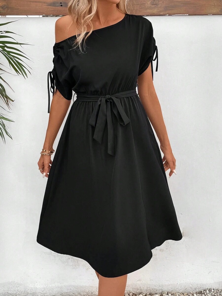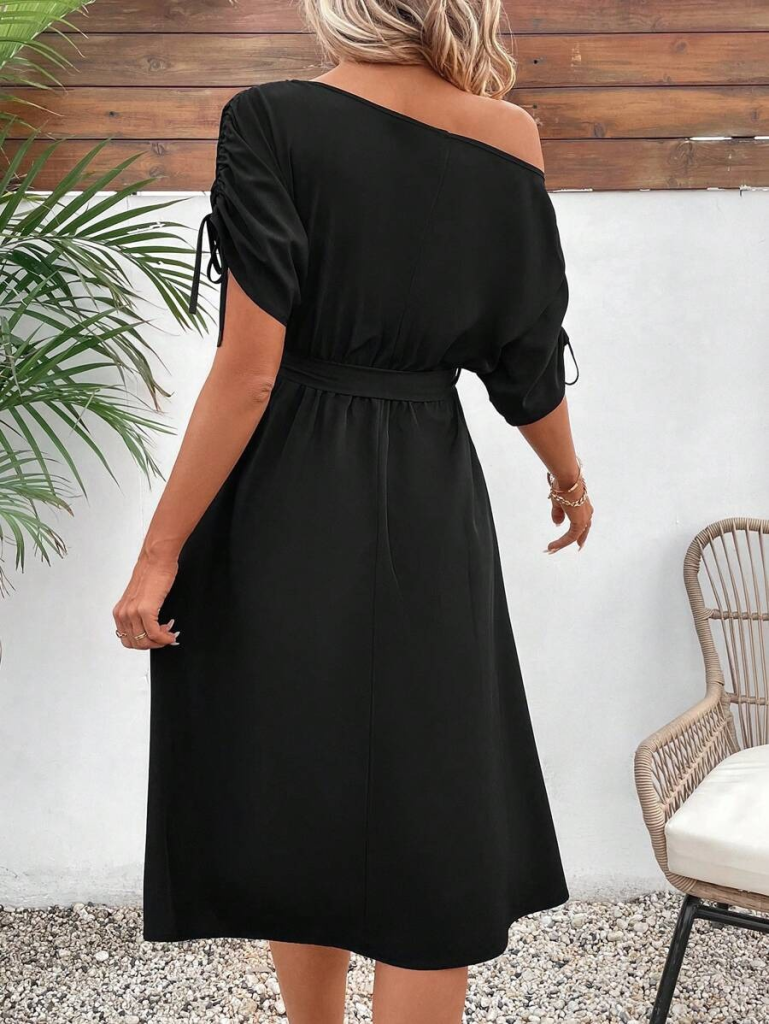 Kadın Tek Omuzu Açık Kol Ucu Fiyonklu Belden Kuşaklı Yırtmaç Detaylı Viskon Elbise