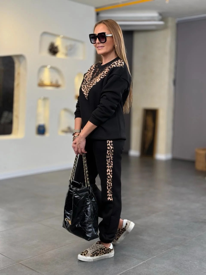 Kadın üç Iplik Kumaş Leopar Desenli Dantel Detaylı Ikili Takım