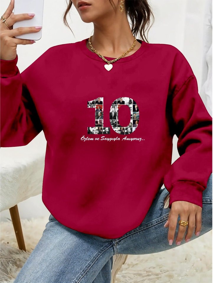 Kadın Uzun Kollu 10 Kasım Atatürkü Anma Gününe Özel Viskon İki İplik Kumaş Sweat