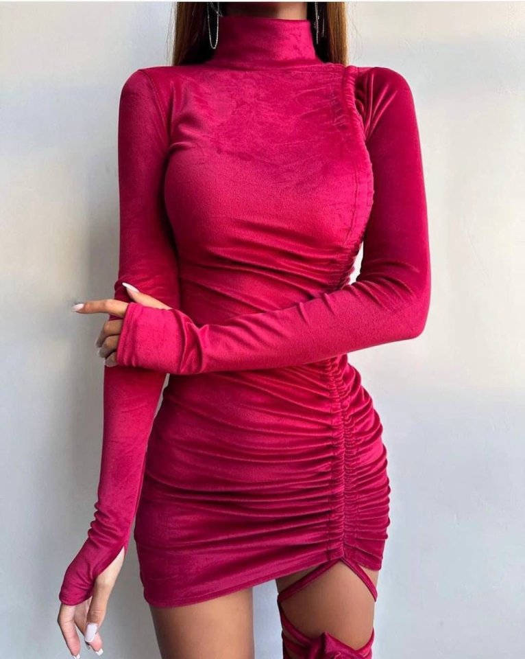 Kadın Uzun Kollu Balıkçı Yaka Büzgü Ve Gül Detay Kadife Kumaş Mini Elbise