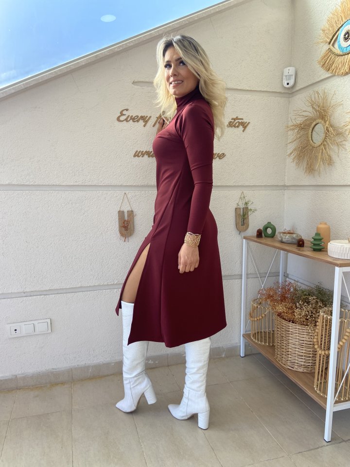 Kadın Uzun Kollu Balıkçı Yaka Derin Yırtmaç Detay Krep Elbise