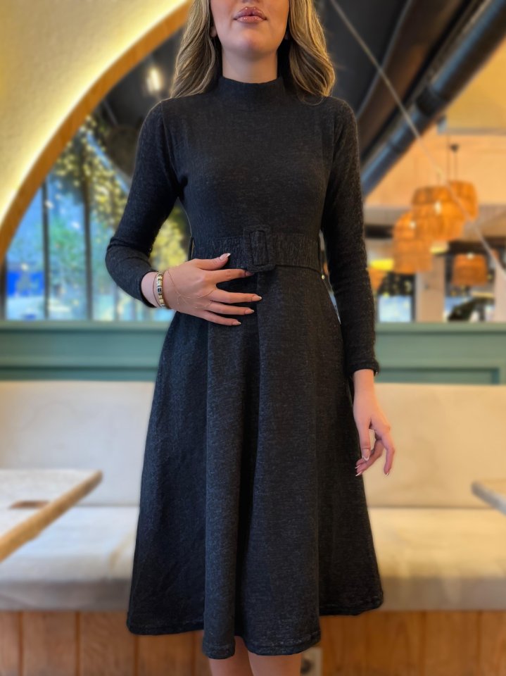 Kadın Uzun Kollu Balıkçı Yaka Kemer Detaylı Yumoş Midi Elbise