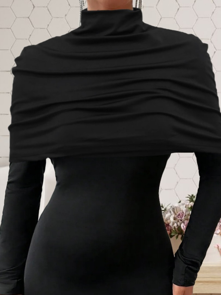 Kadın Uzun Kollu Balıkçı Yaka Omuz Katlamalı Dalgıç Kısa Elbise