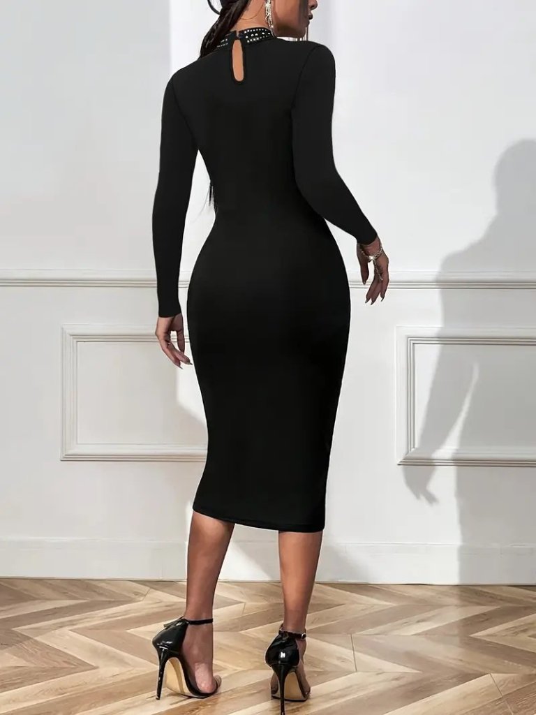 Kadın Uzun Kollu Balıkçı Yaka Taşlı Damla Detay Midi Ithal Krep Elbise