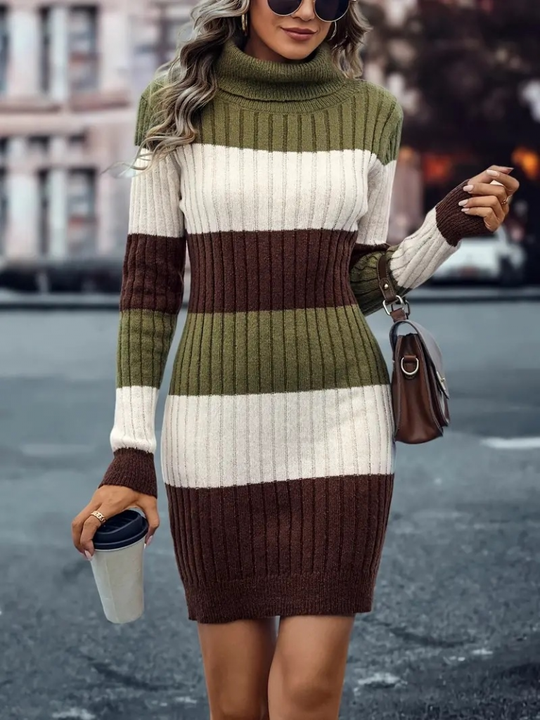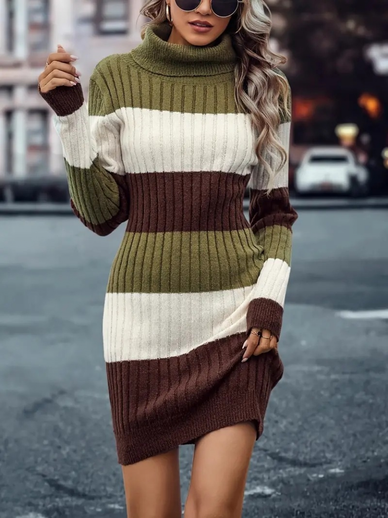 Kadın Uzun Kollu Balıkçı Yaka üç Renk Triko Mini Elbise