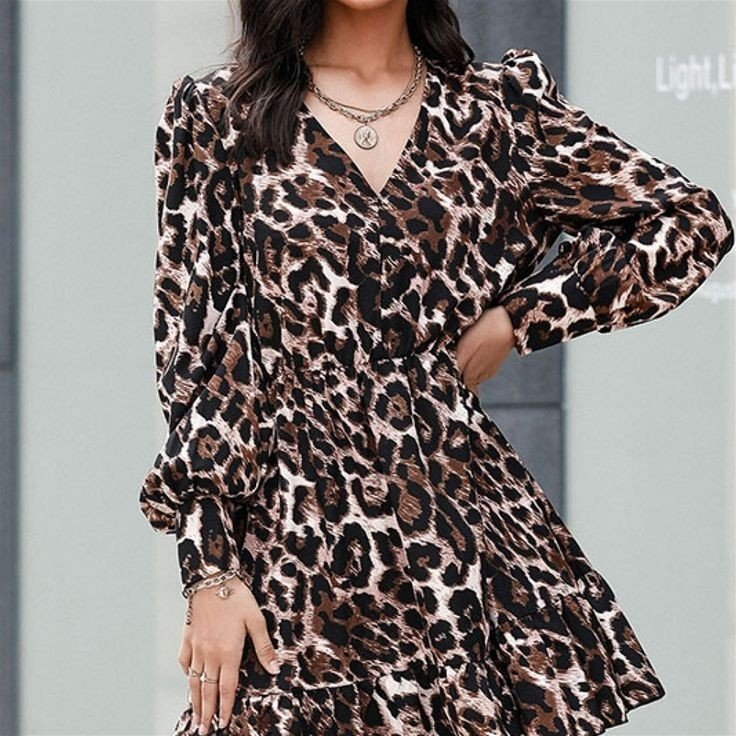 Kadın Uzun Kollu Beli Lastikli Etek Ucu Volanlı Leopar Desen Krep Elbise