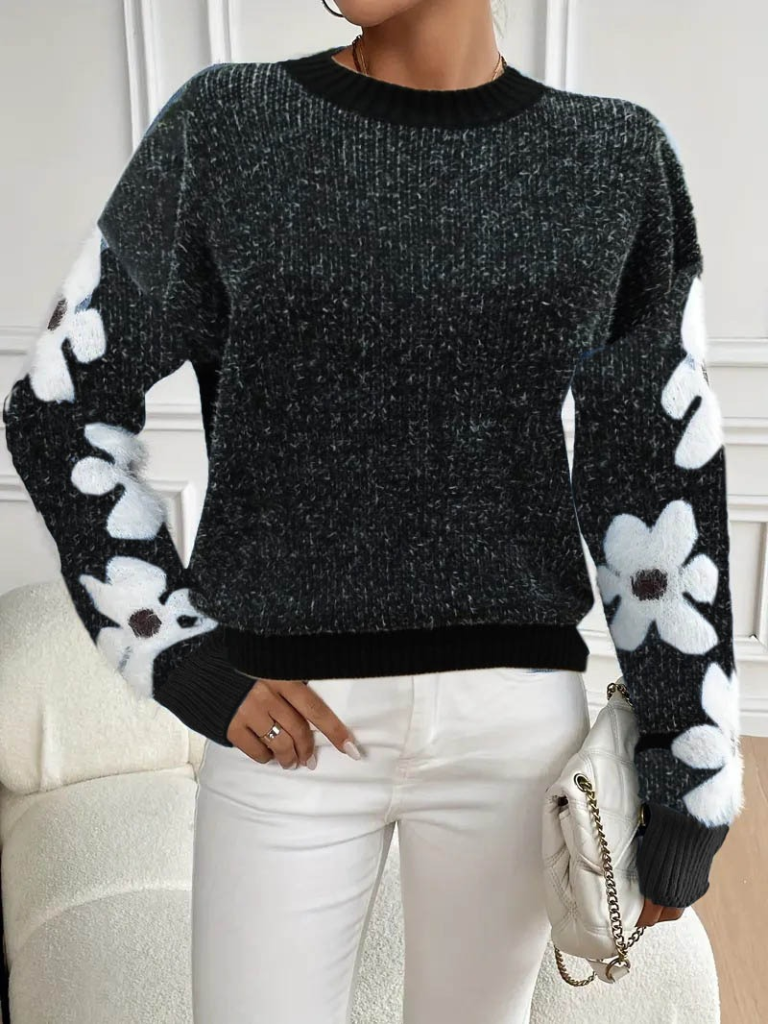 Kadın Uzun Kollu Bisiklet Yaka çiçek Desenli Triko Bluz