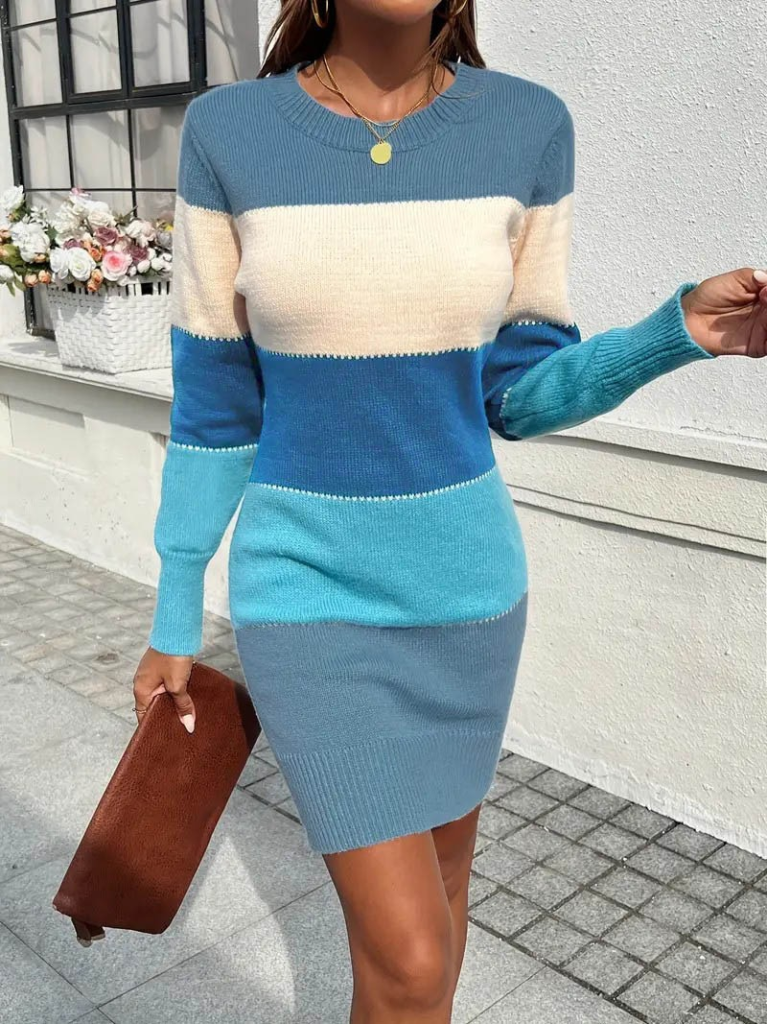 Kadın Uzun Kollu Bisiklet Yaka çizgili Kısa Triko Elbise