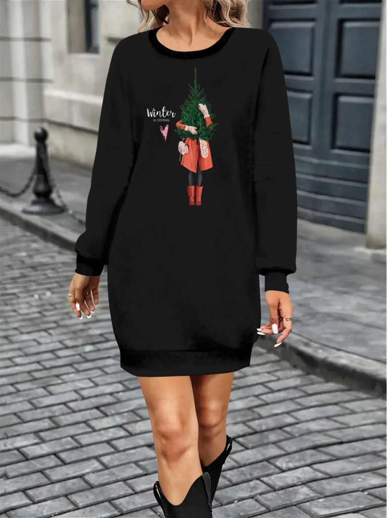 Kadın Uzun Kollu Bisiklet Yaka Desenli Kısa Viskon Iki Iplik Elbise