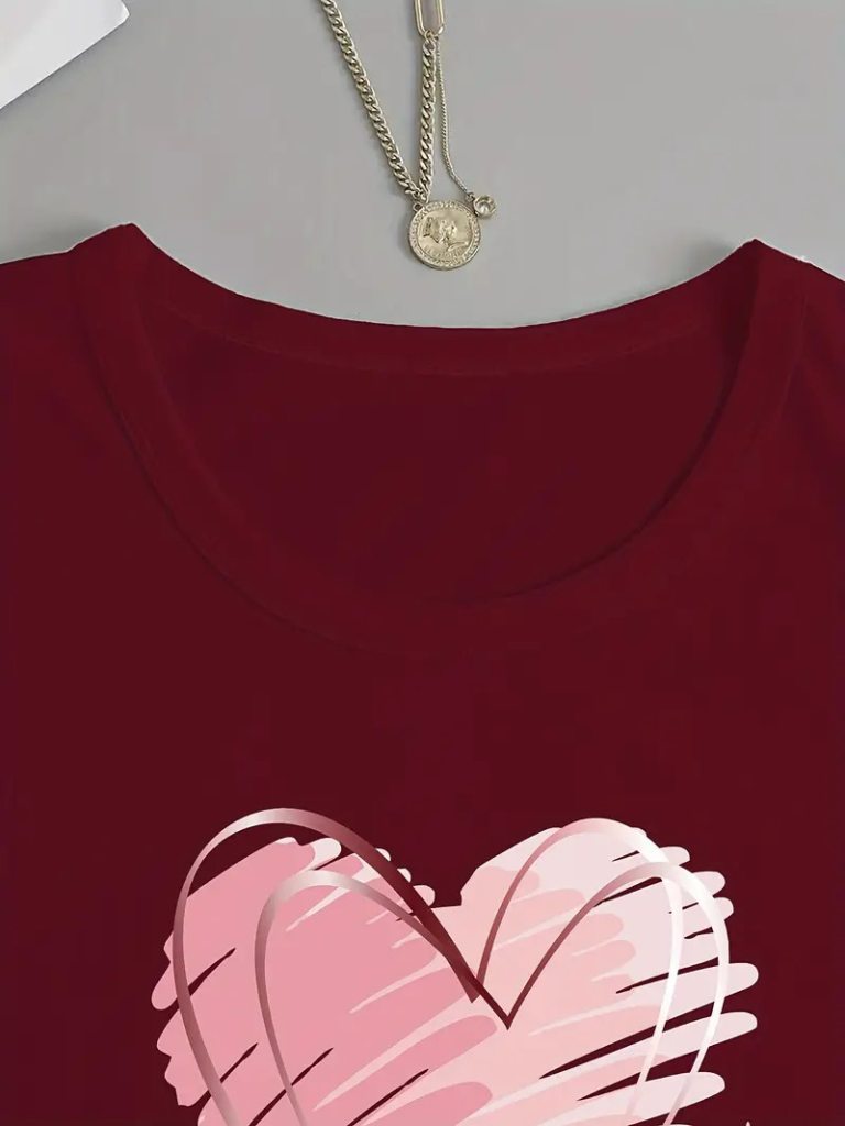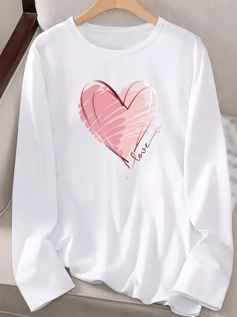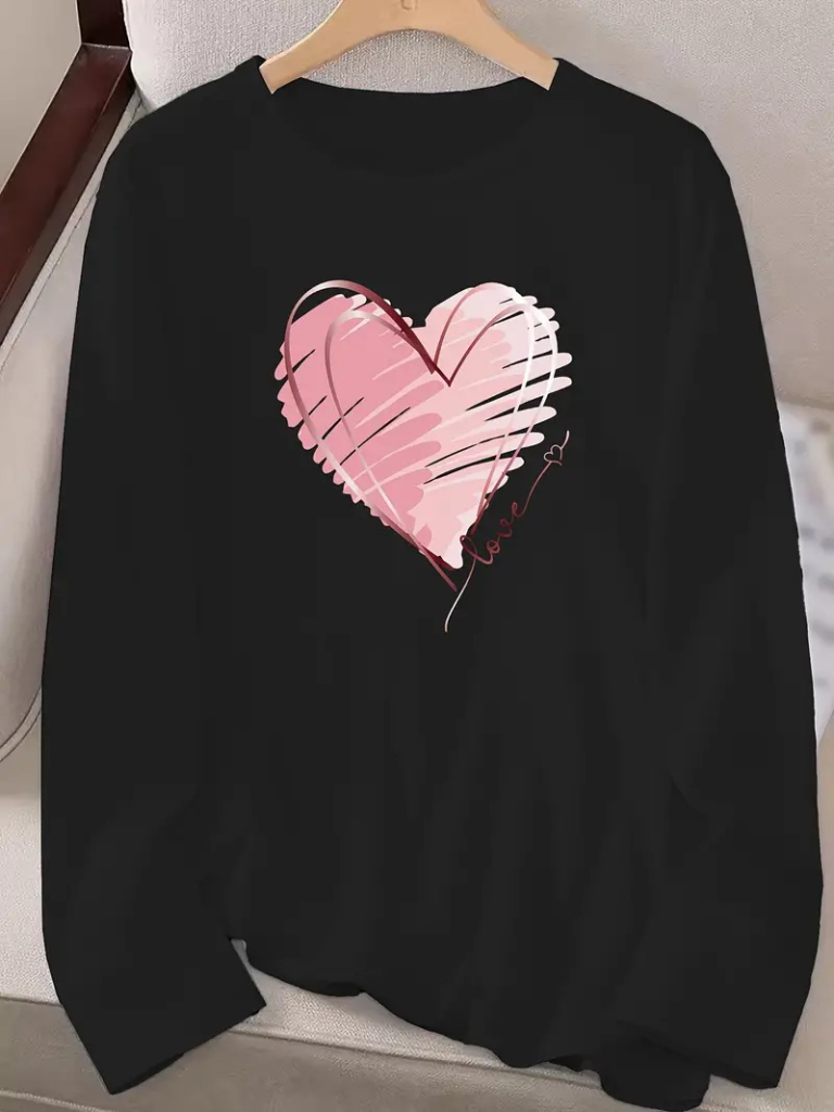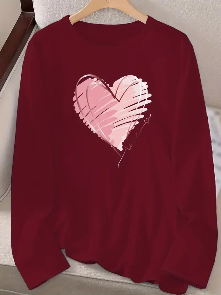 Kadın Uzun Kollu Bisiklet Yaka Kalp Desenli Viskon Bluz