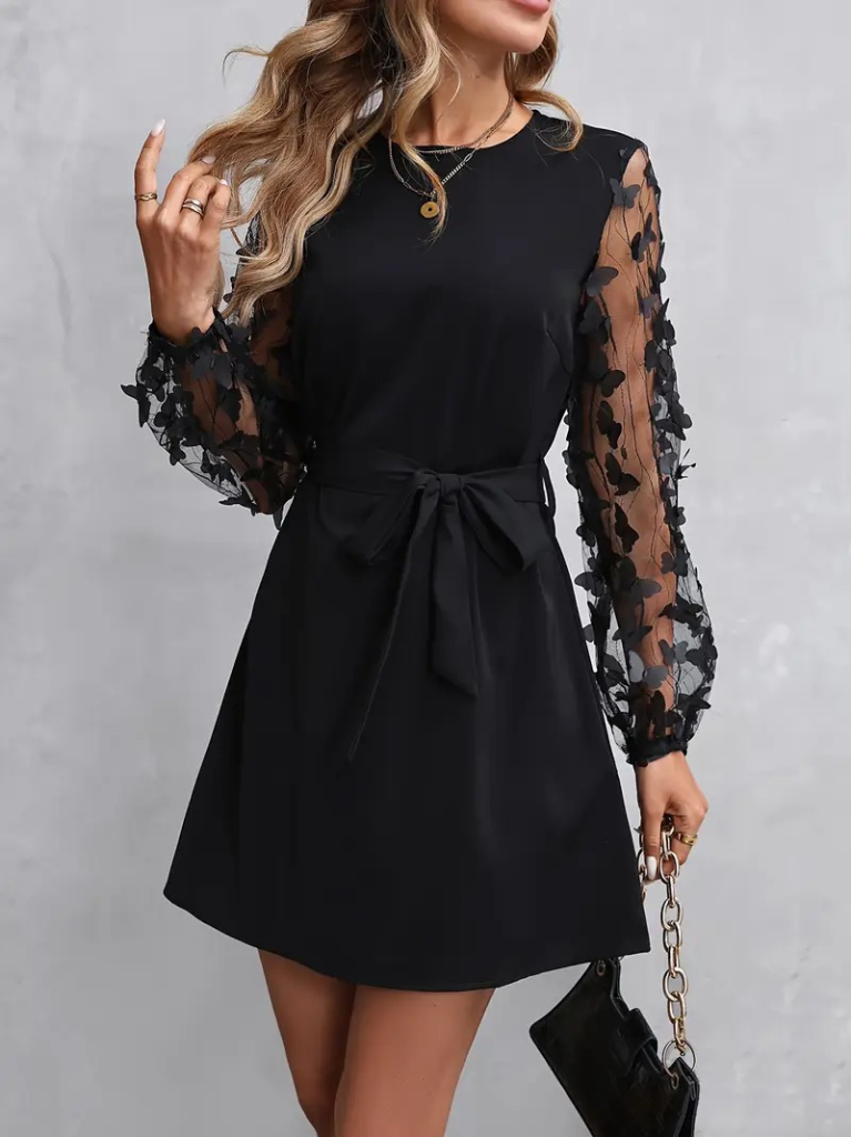 Kadın Uzun Kollu Bisiklet Yaka Kollar Tül Kelebek Detaylı Ithal Krep Elbise