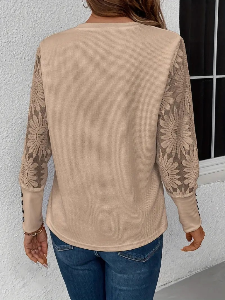 Kadın Uzun Kollu Bisiklet Yaka Kolları çiçekli Waffle Bluz