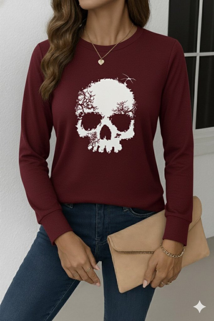 Kadın Uzun Kollu Bisiklet Yaka Kurukafa Desenli Viskon Bluz