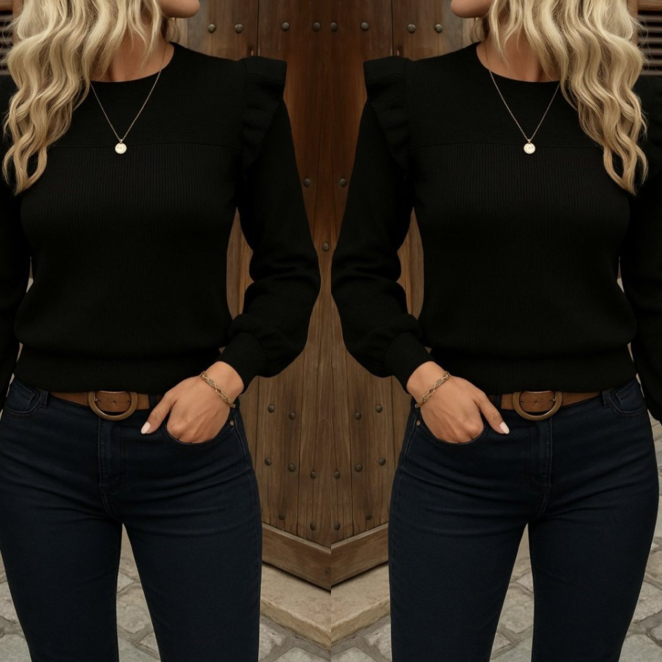 Kadın Uzun Kollu Bisiklet Yaka Omuzları Fırfırlı Triko Bluz