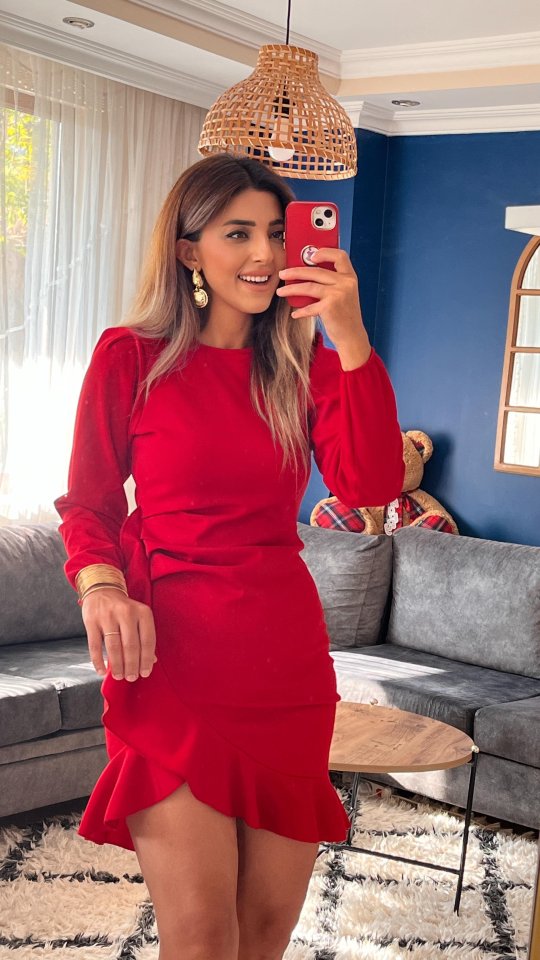 Kadın Uzun Kollu Bisiklet Yaka önden Volanlı Ithal Krep Elbise