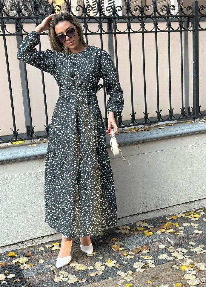 Kadın Uzun Kollu Bisiklet Yaka Papatya Desen Kuşak Dahil Maxi Boy Elbise