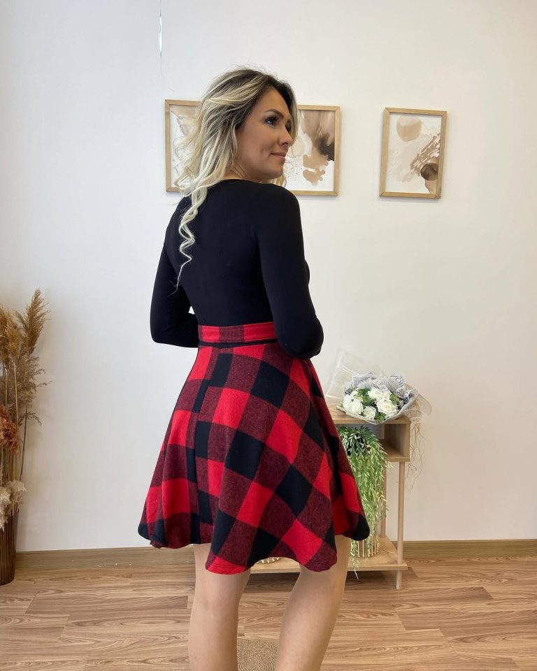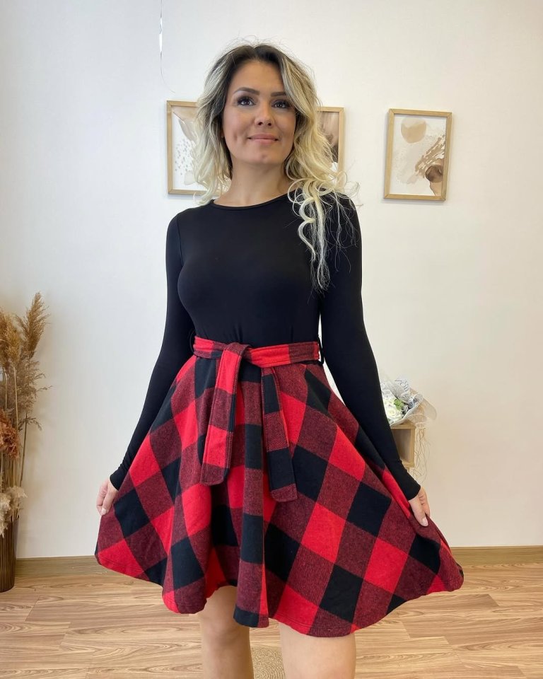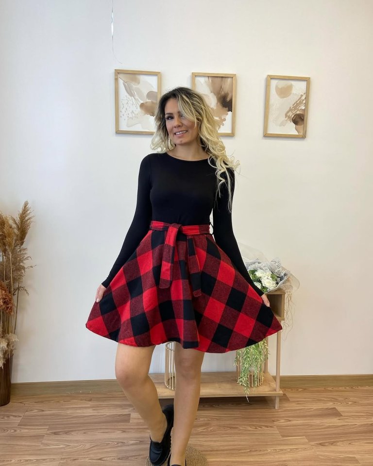 Kadın Uzun Kollu Bisiklet Yaka üst Viskon Alt Ekose Kısa Elbise