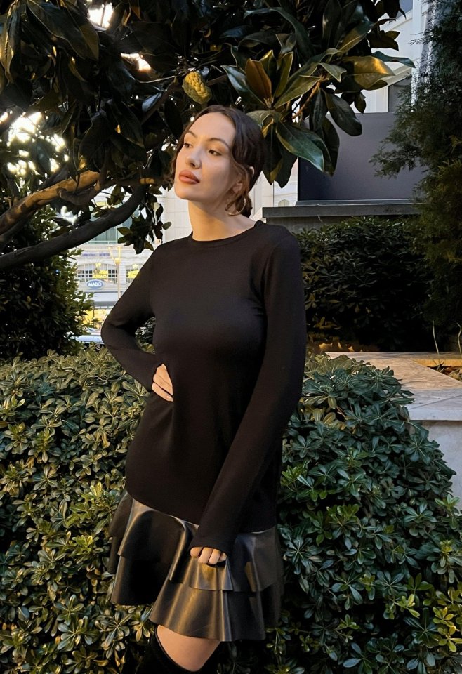 Kadın Uzun Kollu Bisiklet Yaka üst Viskon Etek Ucu Deri Kısa Elbise