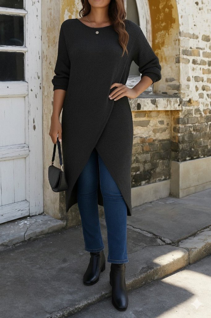Kadın Uzun Kollu Bisiklet Yakalı önden çapraz Kesim Detaylı Midi Triko Elbise