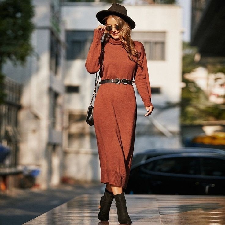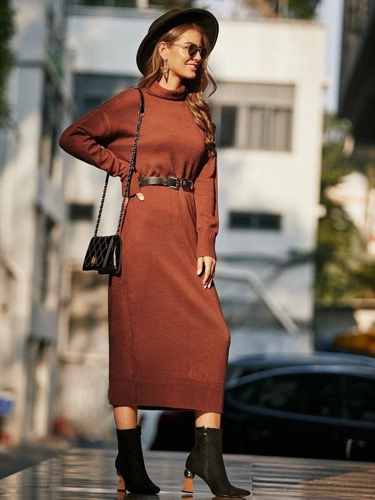 Kadın Uzun Kollu Boğazlı Midi Boy Triko Elbise (kemersiz)