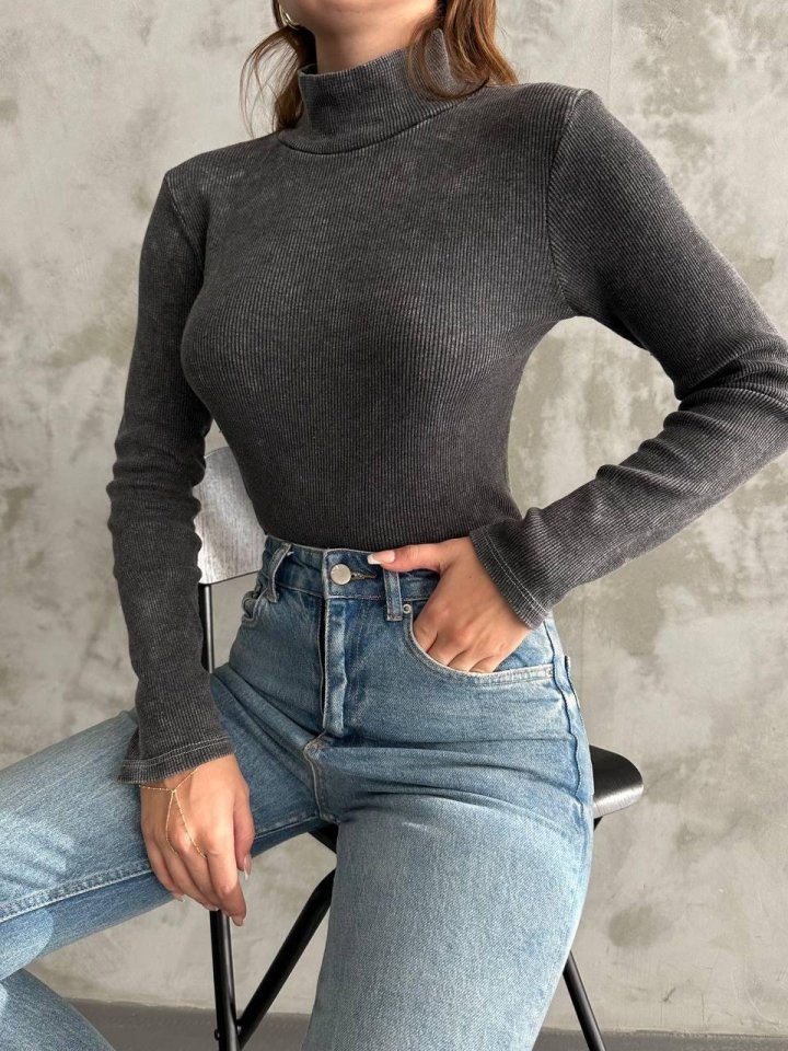Kadın Uzun Kollu Boğazlı Yaka Asit Yıkamalı Kaşkorse Kumaş Kazak