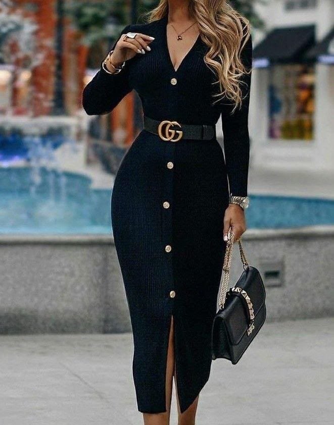 Kadın Uzun Kollu Burgulukumaş V Yaka Düğme Ve Aksesuarlı Kemer Detay Elbise