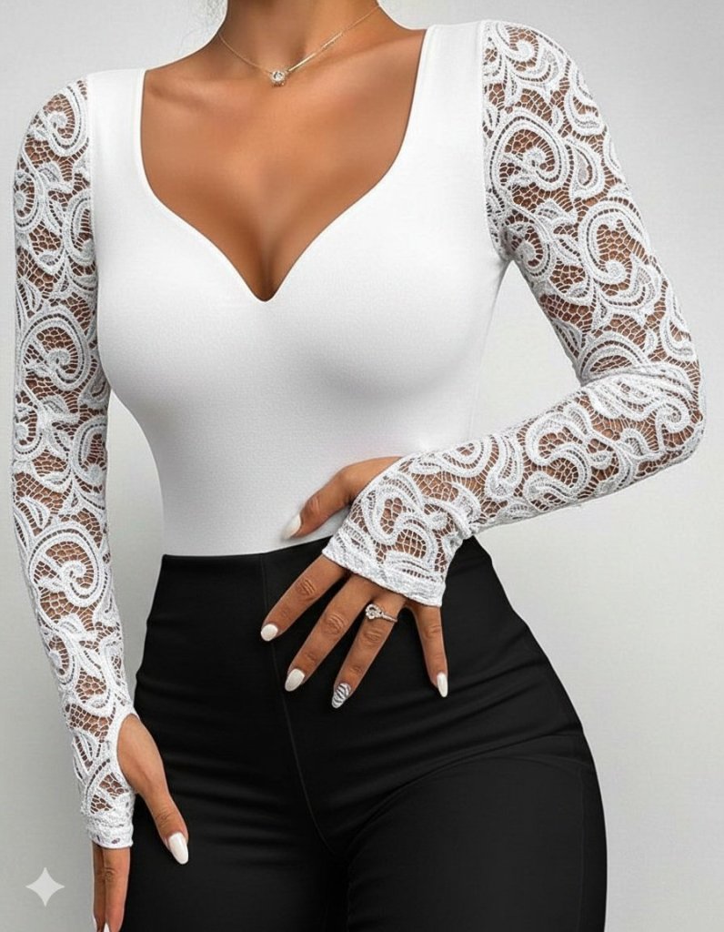 Kadın Uzun Kollu Dantelli Dekolte Detaylı Dalgıç Bluz