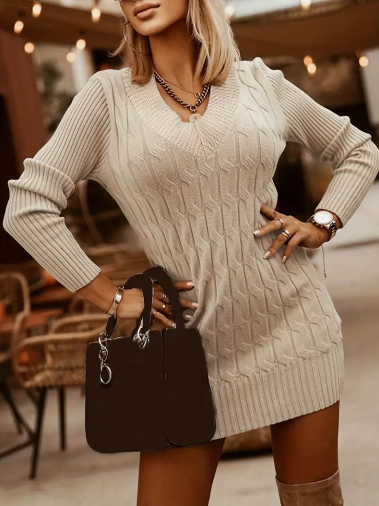 Kadın Uzun Kollu Derin V Yakalı Kısa Triko Elbise