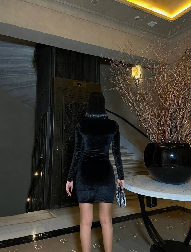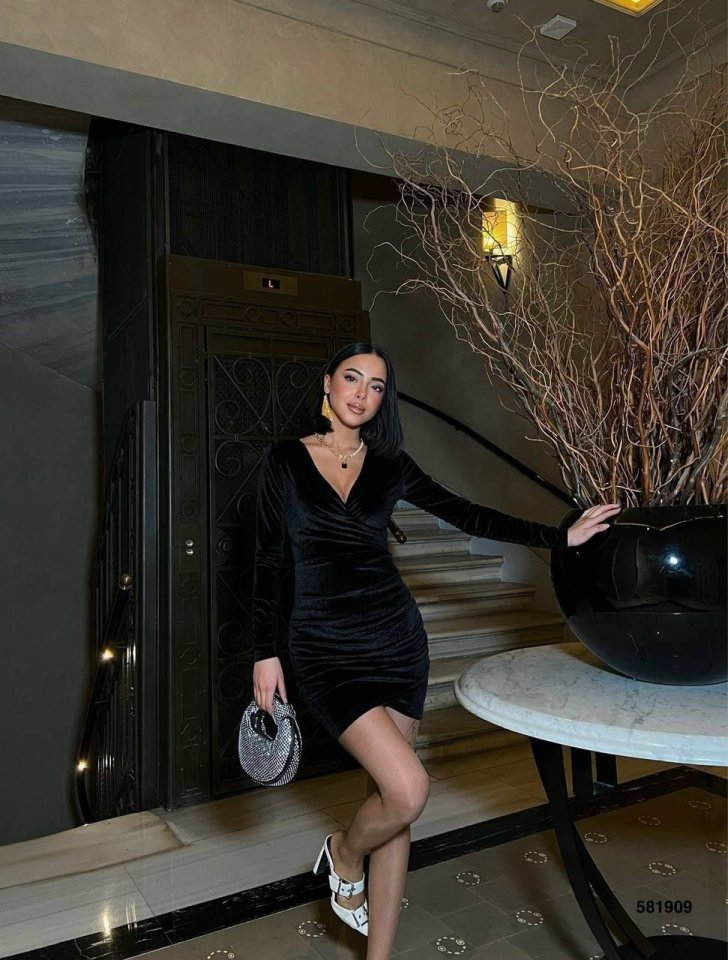 Kadın Uzun Kollu Göğüs Dekolteli Kadife Kumaş Mini Kruvaze Elbise