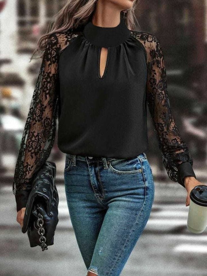 Kadın Uzun Kollu Göğüs Pencere Detay Yaka Boğazlı Kolları Tüllü Sandy Bluz