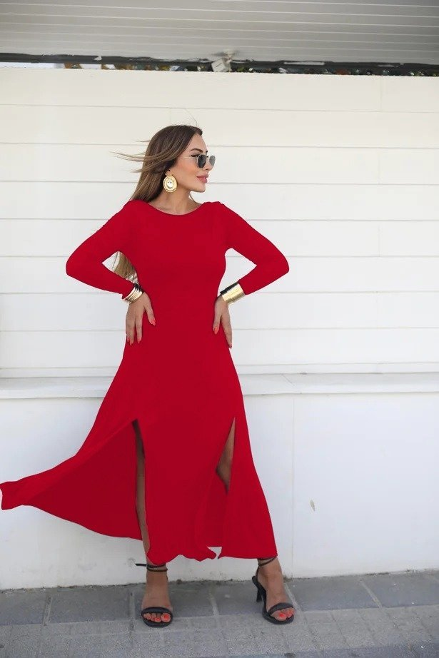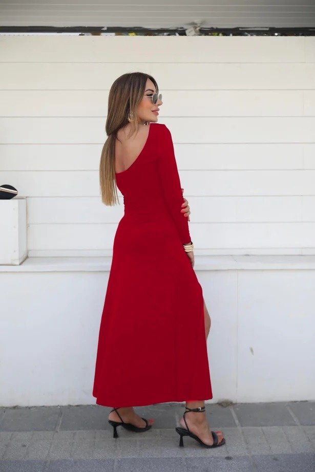 Kadın Uzun Kollu Hafif Kayık Yaka Sırt Dekolteli Yırtmaç Detaylı Viskon Tam Boy Elbise