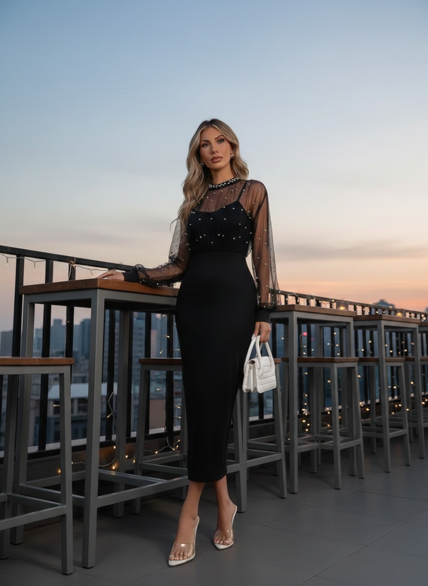 Kadın Uzun Kollu Halka Yaka Tül Inci Detaylı Uzun Ithal Krep Elbise