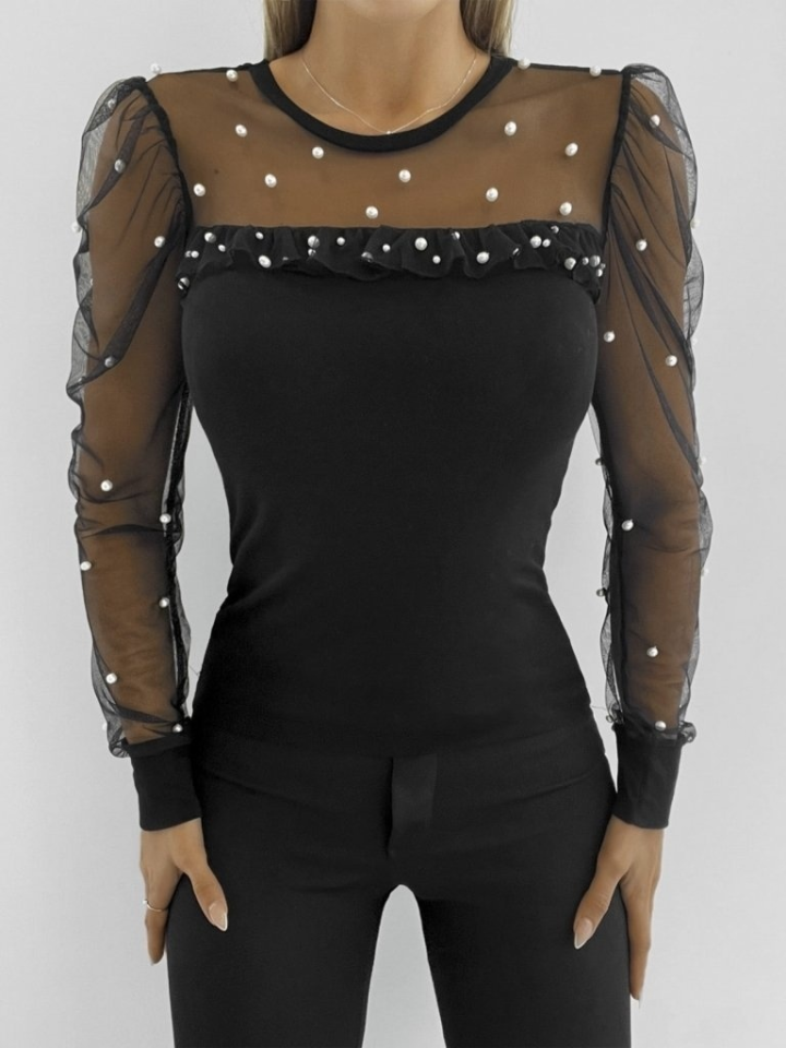 Kadın Uzun Kollu Inci Detaylı Tüllü Viskon Bluz