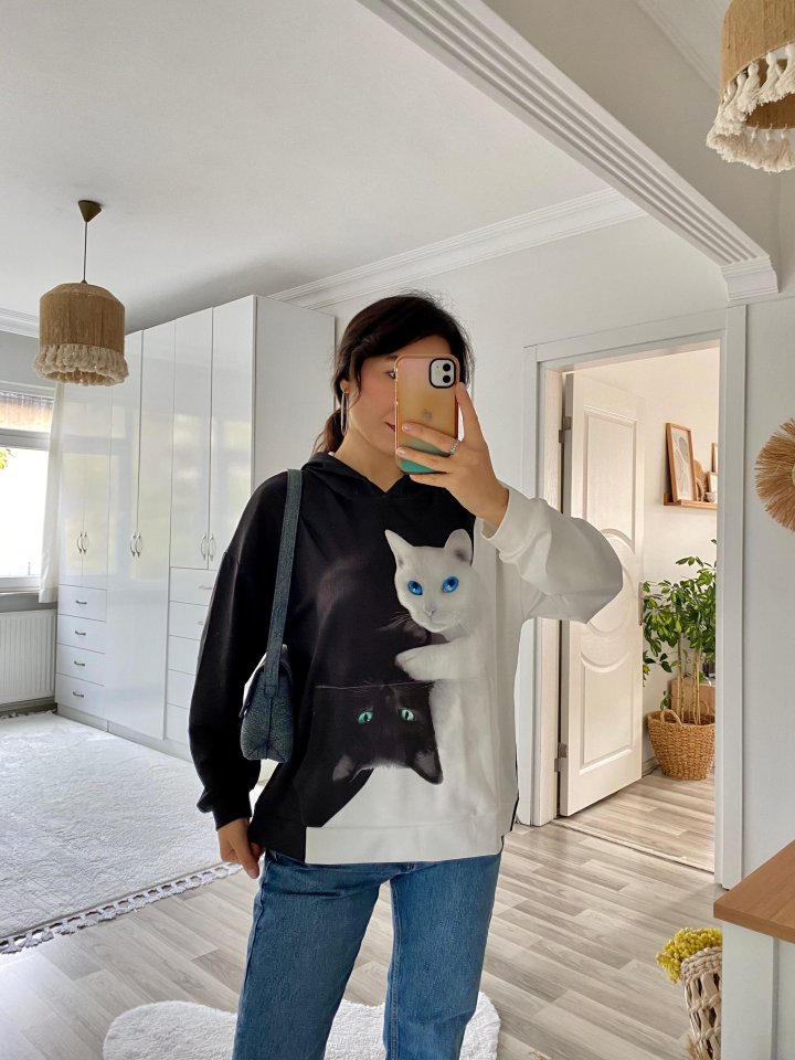 Kadın Uzun Kollu Kapşonlu Bağcıklı Kedi Desenli şardonlu Dalgıç Bluz