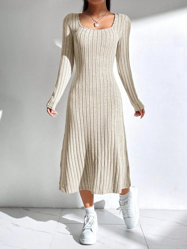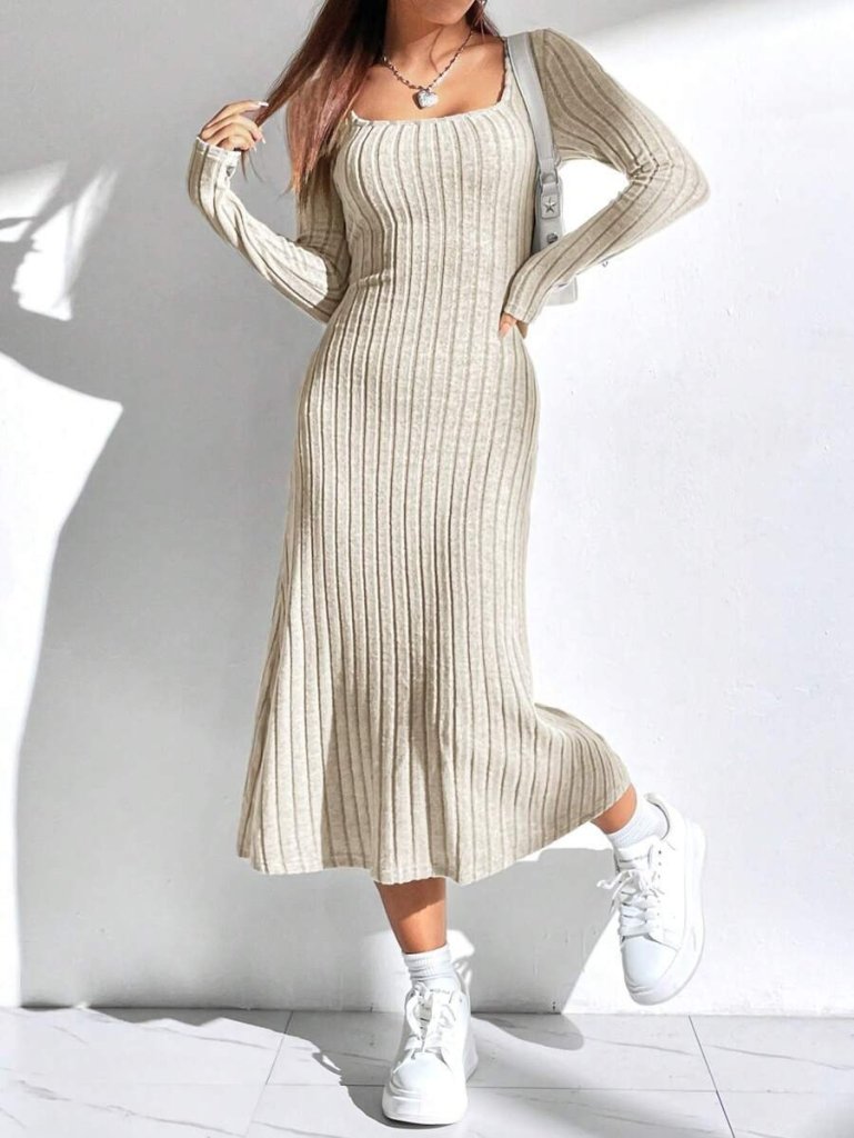 Kadın Uzun Kollu Kare Yaka Midi Kaşkorse Elbise
