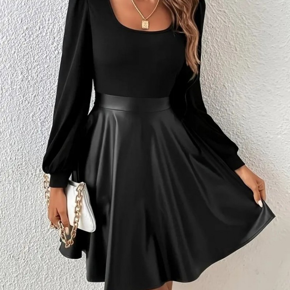 Kadın Uzun Kollu Kare Yaka üst Viskon Alt Deri Mini Elbise