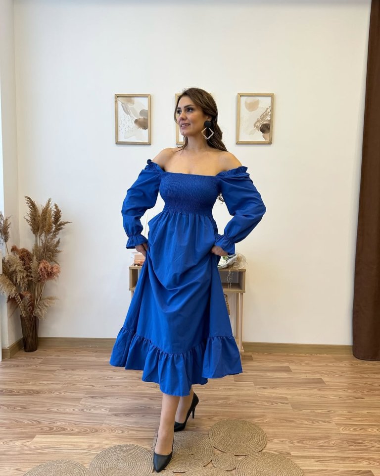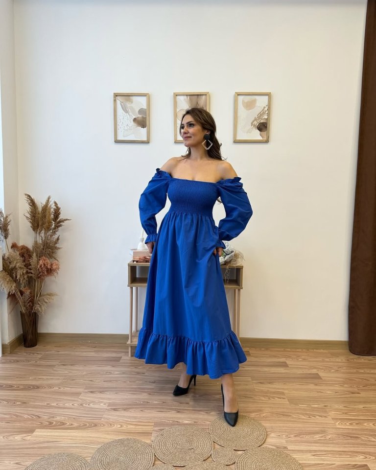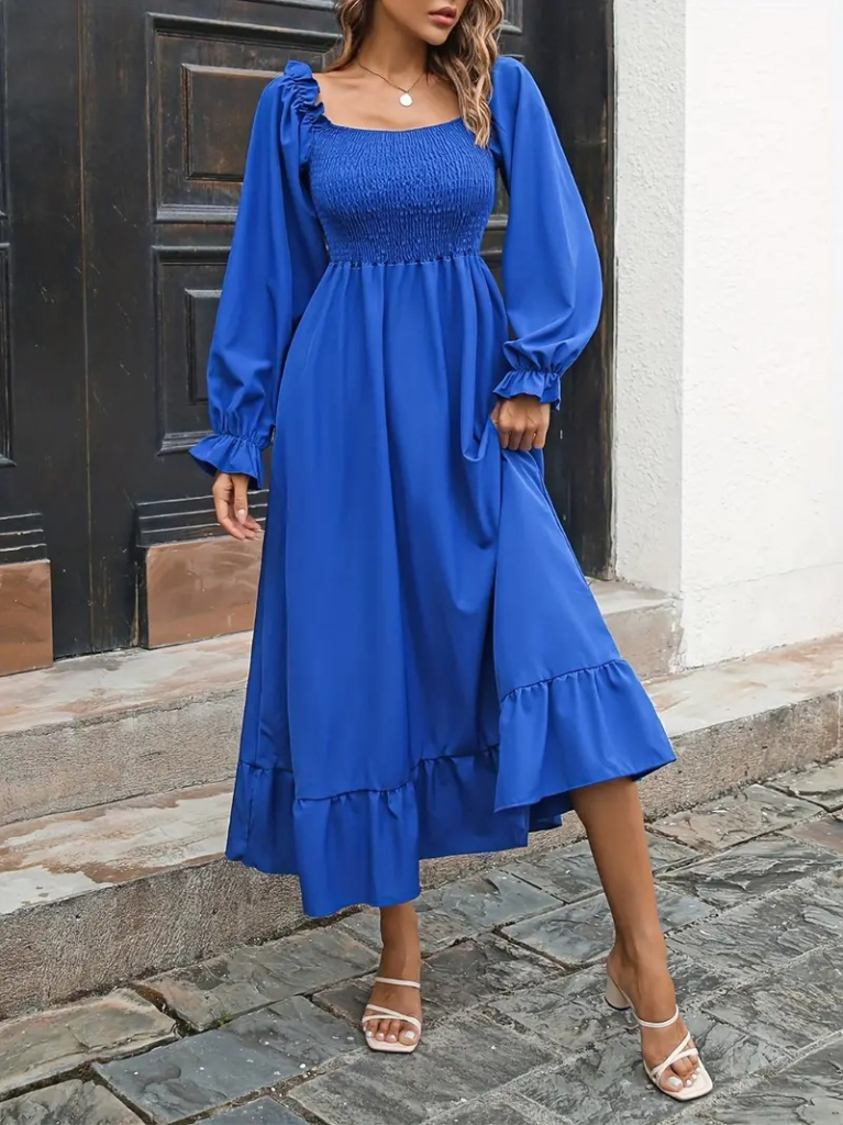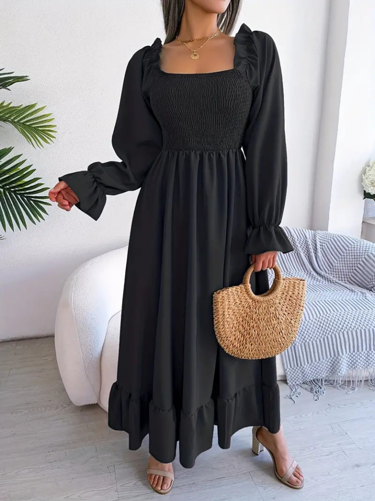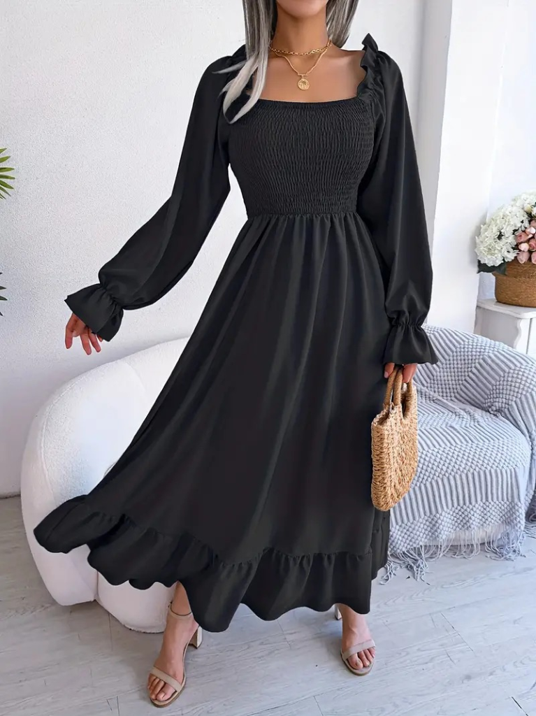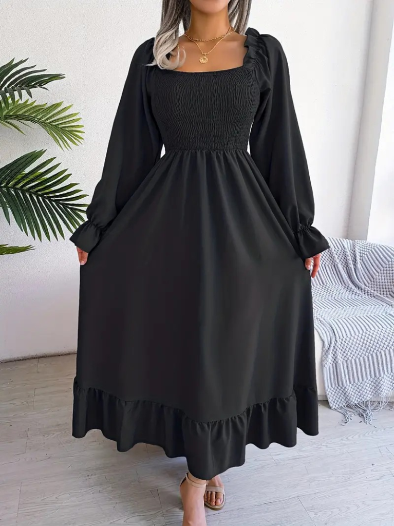 Kadın Uzun Kollu Kare Yakalı Gipeli Uzun Trikoton Elbise