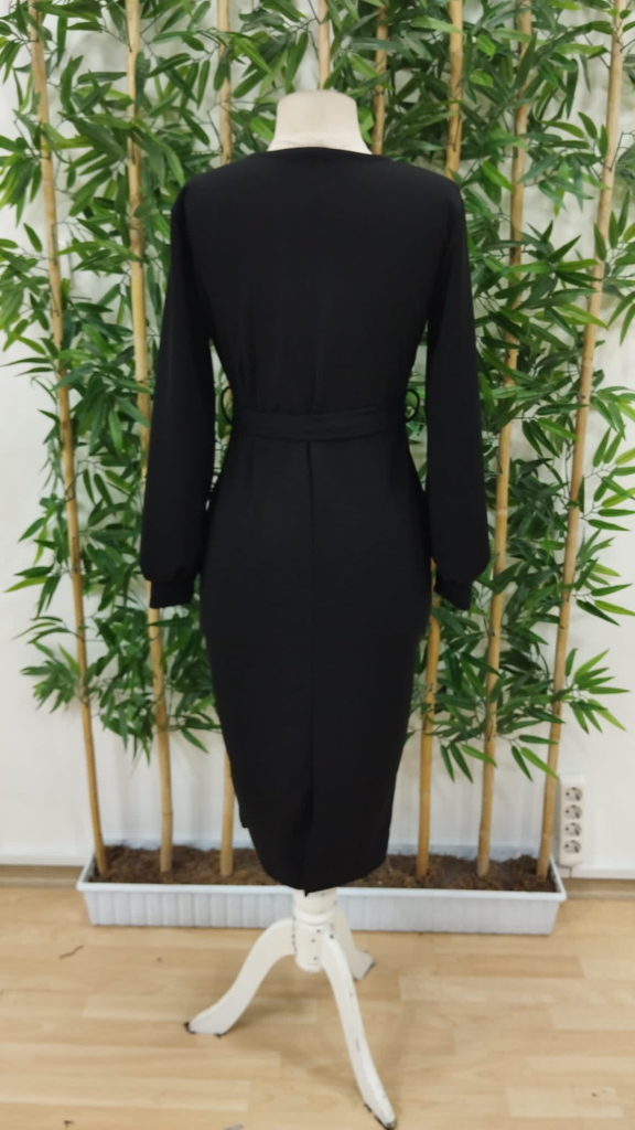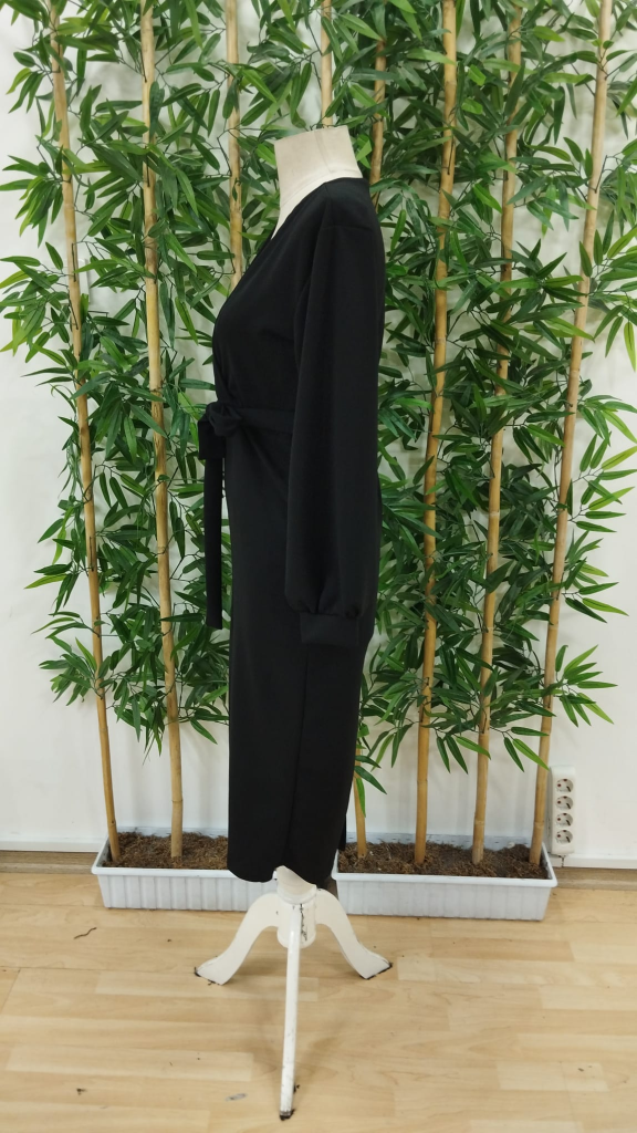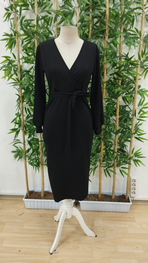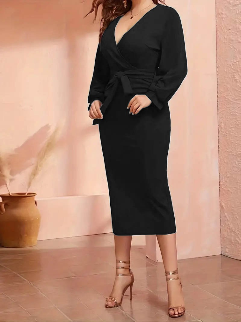 Kadın Uzun Kollu Kruvaze Yaka Belden Kuşaklı Midi Ithal Krep Elbise